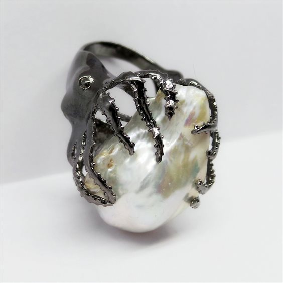 Anello artigianale in argento con piovra che avvolge una perla coltivata in acqua dolce.
