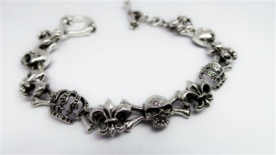 Bracciale artigianale in argento con teschi. Chiusura a farfalla.