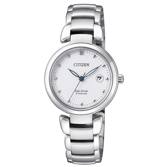 Orologio solo tempo. Cassa in super titanio lucida e opaca. ø 29 mm. - spessore 8 mm.. Movimento Eco-Drive con riserva di carica 180 giorni. Vetro zaffiro. Quadrante bianco con diamantino alle ore 12 -indici lucidi - lancette nero inchiostro e luminose. Bracciale regolabile in super titanio con chiusura dèployante con pulsanti. Impermeabile 5 bar(5 atm). Peso 44 grammi. Garanzia 2 anni con certificato.