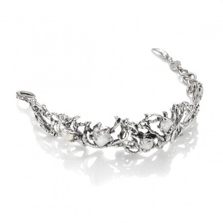 Bracciale in Argento 925 e perle naturali. Lunghezza 19 cm. Collezione Mari del Sud - L'argento fluisce in forme coralline e si sposa con le perle naturali d'acqua dolce dai riflessi bianco opalescenti. Peso: 59 gr. Lunghezza regolabile con chiusura a moschettone Fatto a mano in Italia.