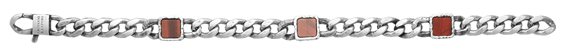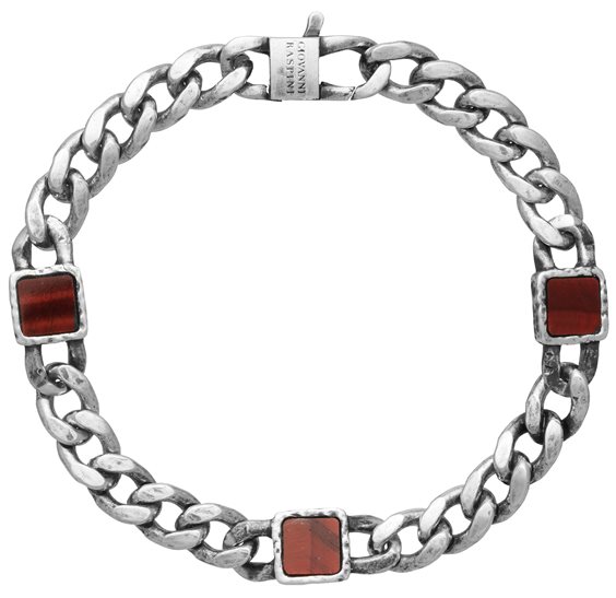 Argento e Occhio di Toro (la pietra dura naturale dalle calde sfumature bruno rossastre), una catena classica che diventa gioiello contemporaneo. Realizzata completamente a mano, come la chiusura a moschettone, dal design in continuità stilistica con la catena.