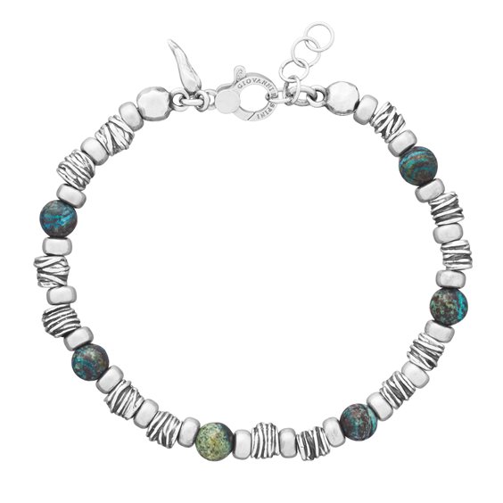 Un bracciale da uomo che offre un'elegante fusione di elementi naturali e luminosi. Composto da cinque sferette in diaspro verde, il bracciale è arricchito da dettagli in argento, creati tramite la tecnica della fusione a cera persa e successivamente brunito. Realizzato a mano in azienda.