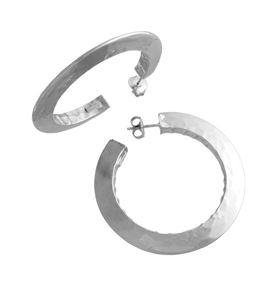 La forma più perfetta, il cerchio. Un metallo martellato e luminosissimo, l'argento. Orecchini che esprimono il connubio ideale tra forza e contemporaneità nello stile Giovanni Raspini. Caratterizzati da linee che disegnano forme decise ed eleganti, vengono realizzati completamente a mano in azienda.
