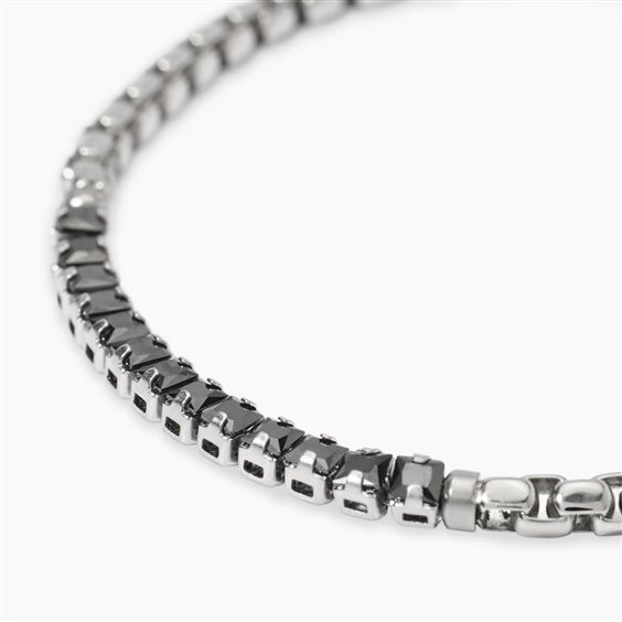 Bracciale in acciaio 316L, lunghezza regolabile da 19 a 21 cm, con catena veneta e sezione tennis di cristalli neri taglio princess. Dimensioni: larghezza catena 3.5 mm, pietre 3x3 mm