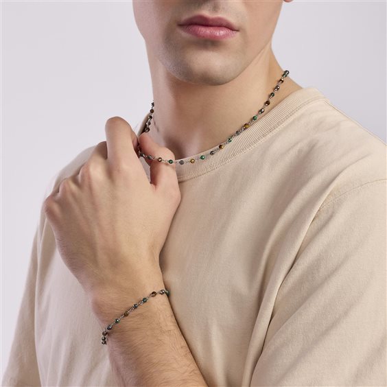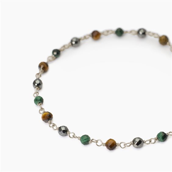 Bracciale in argento 925 rodiato con occhio di tigre, e malachite sintetica. Chiusura a moschettone. Misura regolabile da cm 18 a cm 20,5.