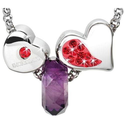 Collana drops in acciao a forma di cuore con pietra viola al centro e due cuori in acciaio con cristalli rossi Lunghezza: cm 42