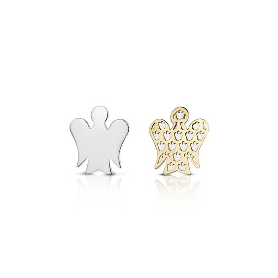 orecchini angelo a lastra in oro bianco e angelo traforato in oro giallo , chiusura con perno e farfallina misura base 1,1 cm - altezza 1,2 . regolarmente indossati uno di un colore dell'oro diverso dall'altro tutto con certificato di originalita'.