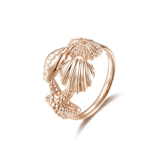 Anello in argento placcatura in oro rosa con guscio di riccio di mare, conchiglia Cripea, conchiglia di San Giacomo e stella marina