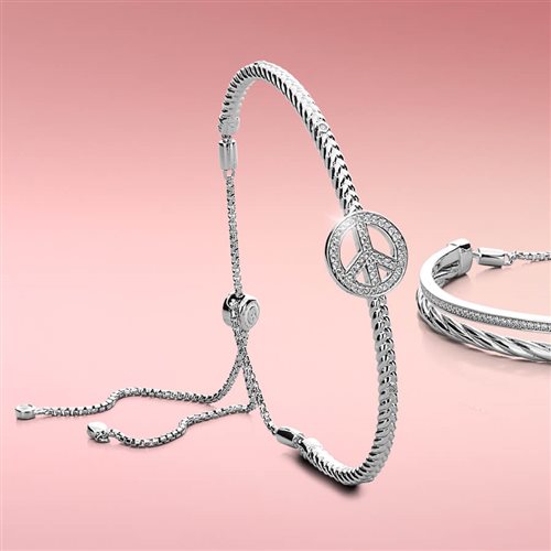 Bracciale Da Donna Di Rosato Della Collezione Sogni. Bracciale Rigido In Argento 925 Con Centrale A Forma Di Pace E Zirconi Bianchi. La Larghezza Del Gioiello È Di 56 Mm E Il Peso È Di 10,5 Grammi.