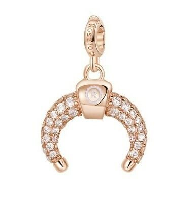 LUNA CRESCENTE Il tuo lato migliore Charm in argento 925‰, galvanica oro rosa, smalto bianco, 80 zirconi bianchi Significato: Cambiamento