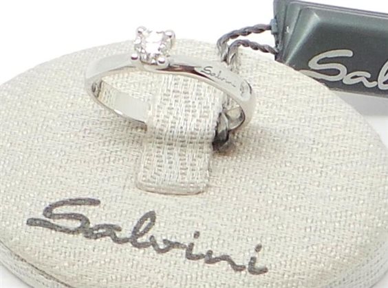 Anello solitario in oro bianco con diamante della linea Classici Solitari, made in Italy. L'importante fusto in oro bianco 750/ooo presenta un design elaborato che segue il canone classico, e presenta nella parte superiore una montatura avvolgente a quattro griffe nella quale è incastonato uno splendido diamante (totale pari a ct 0,25 ). Inoltre il logo 'Salvini' inciso al laser sulla parte laterale del gambo e un piccolo diamantino firma questo gioiello .