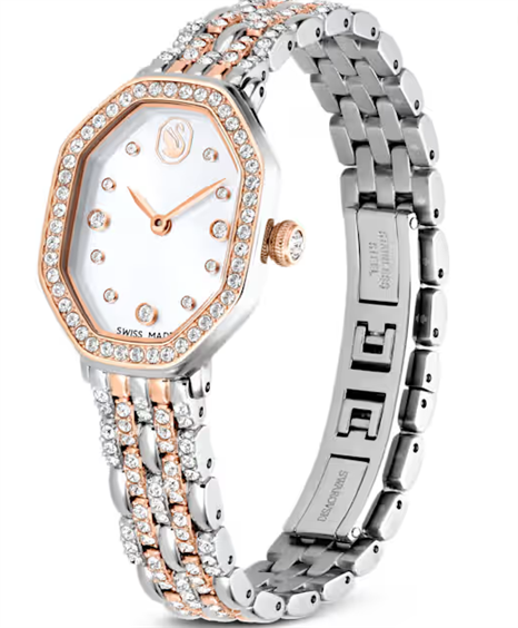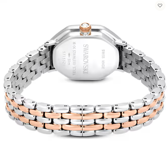 Ispirato all’intramontabile eleganza della famiglia Dextera, questo orologio 18 x 23 mm è realizzato in modo unico nell’iconica forma ottagonale di Swarovski. Combinando l’acciaio inossidabile e la finitura in tonalità oro rosa, il design presenta una lunetta con 46 cristalli montati a pavé e un ulteriore cristallo incastonato all’interno della corona. Il quadrante con motivo sunray include anche delicati indici in cristallo, oltre a sottili lancette e un logo cigno a ore 12. A completare questa radiosa creazione, il bracciale a cinque maglie è impreziosito da 108 cristalli Cry taglio Round, per una brillantezza infinita ad ogni ora. Questo orologio Swiss Made è resistente all’acqua fino a 50 metri. Articolo nr.: 5715521 Collezione: Dextera Dimensioni della cassa: 32 x 23 mm Spessore della cassa: 7 mm Lunghezza indossabile della fascia (minimo - massimo): 12.5 - 19 cm Larghezza della fascia: 1.1 cm Materiale: Cristalli, PVD oro rosa, Acciaio inossidabile Colore: Color argento Tipo di fermaglio: Chiusura a farfalla Materiale del cinturino: Metallo Prodotto in: Svizzera Meccanismo dell'orologio: Quarzo