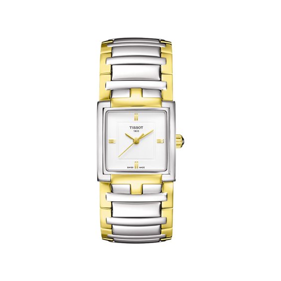 Orologio Tissot da donna rettangolare. Cassa e cinturino in acciaio con inserti color oro. Movimento Swiss-Made.